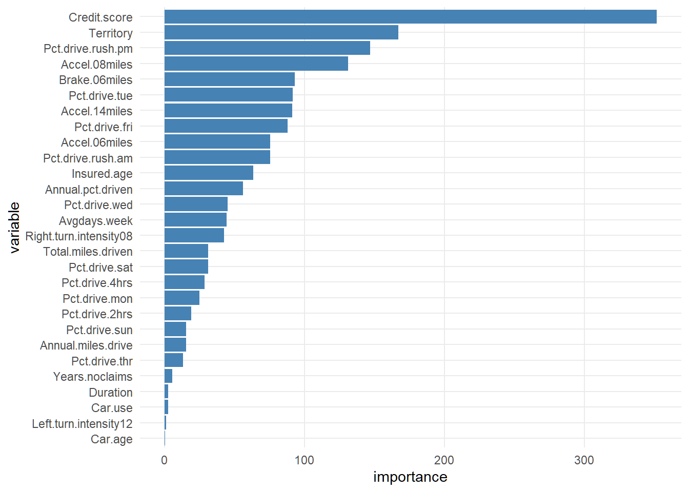 # varImpPlot(rf_claim, main = "")